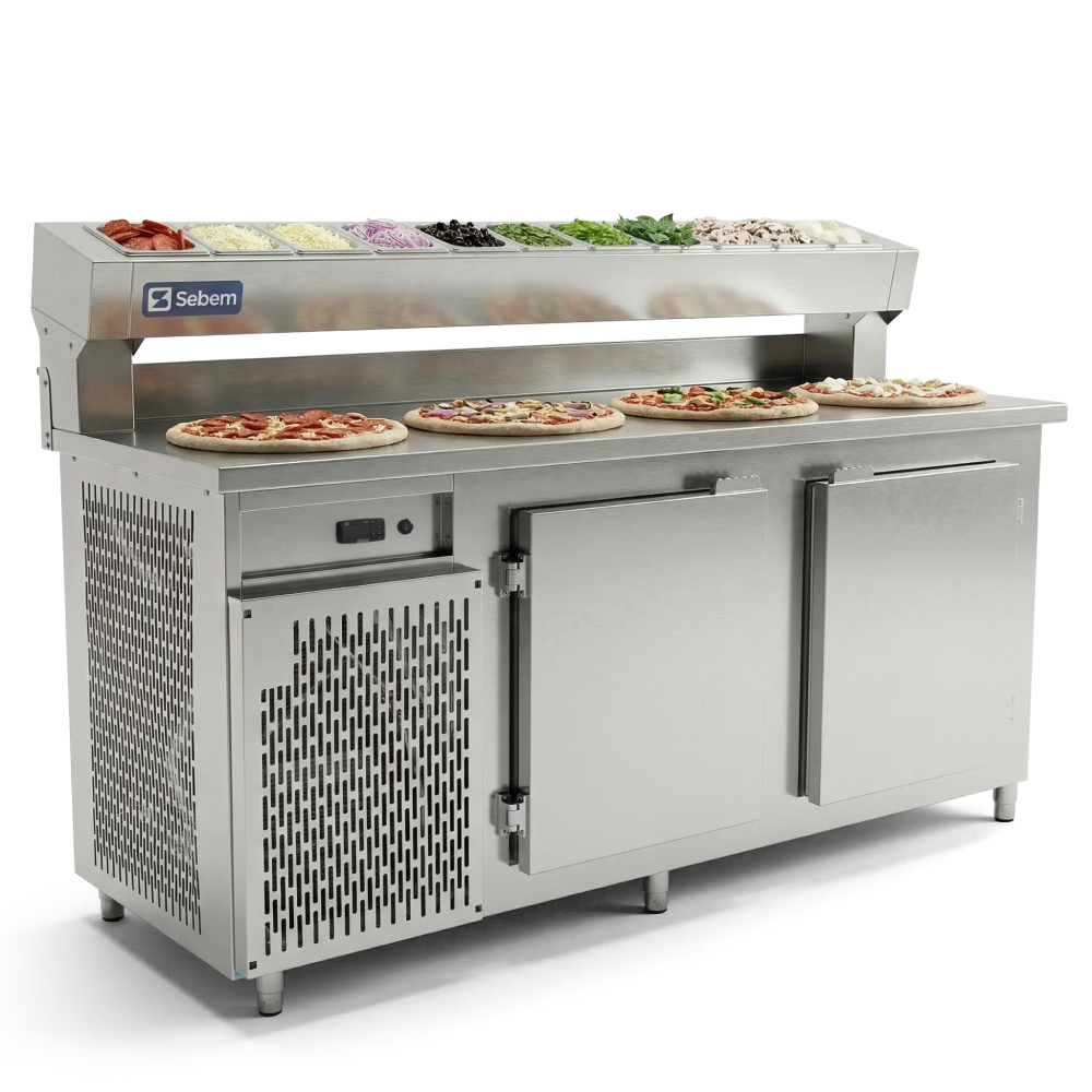 A condimentadora da Sebem é uma das melhores que existe no mercado, pois com ela você ganha tempo de montagem em suas pizzas. Pois ela tem capacidade para 11 cubas Gn’s de 1/6 ou 5 cubas de 1/4, deixando todos os condimentos próximos ao montador. Sua bancada elimina a necessidade de uma mesa de montagem e sua parte inferior possui um refrigerador que elimina a necessidade de uma geladeira vertical, o qual faz com que você ganhe espaço e economia, com equipamento 3 em 1.