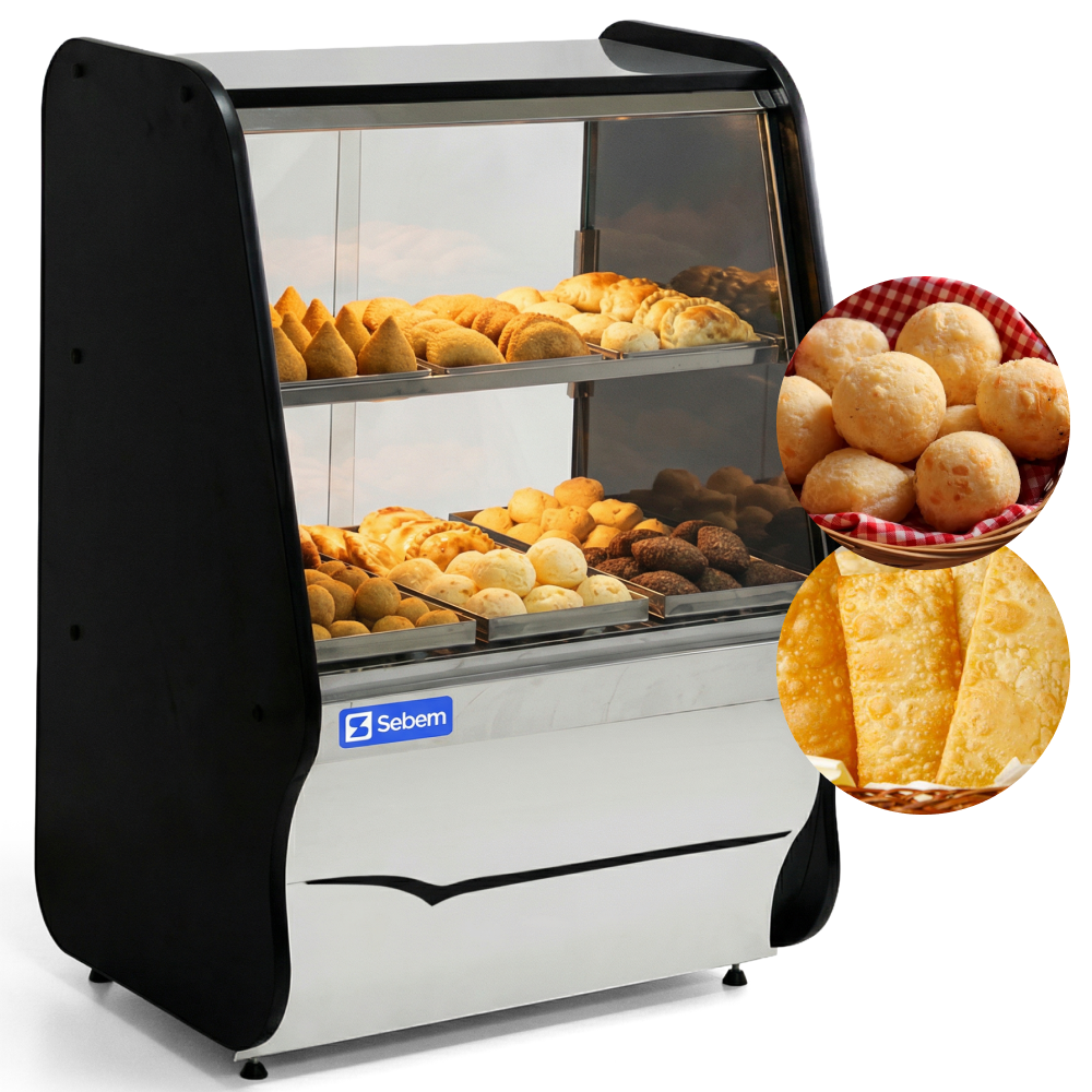 O expositor Sebem é fabricado com regulagem de temperatura de 45 a 95 C°, sendo uma temperatura ideal para manter aquecidos salgados, pães e produtos em geral.