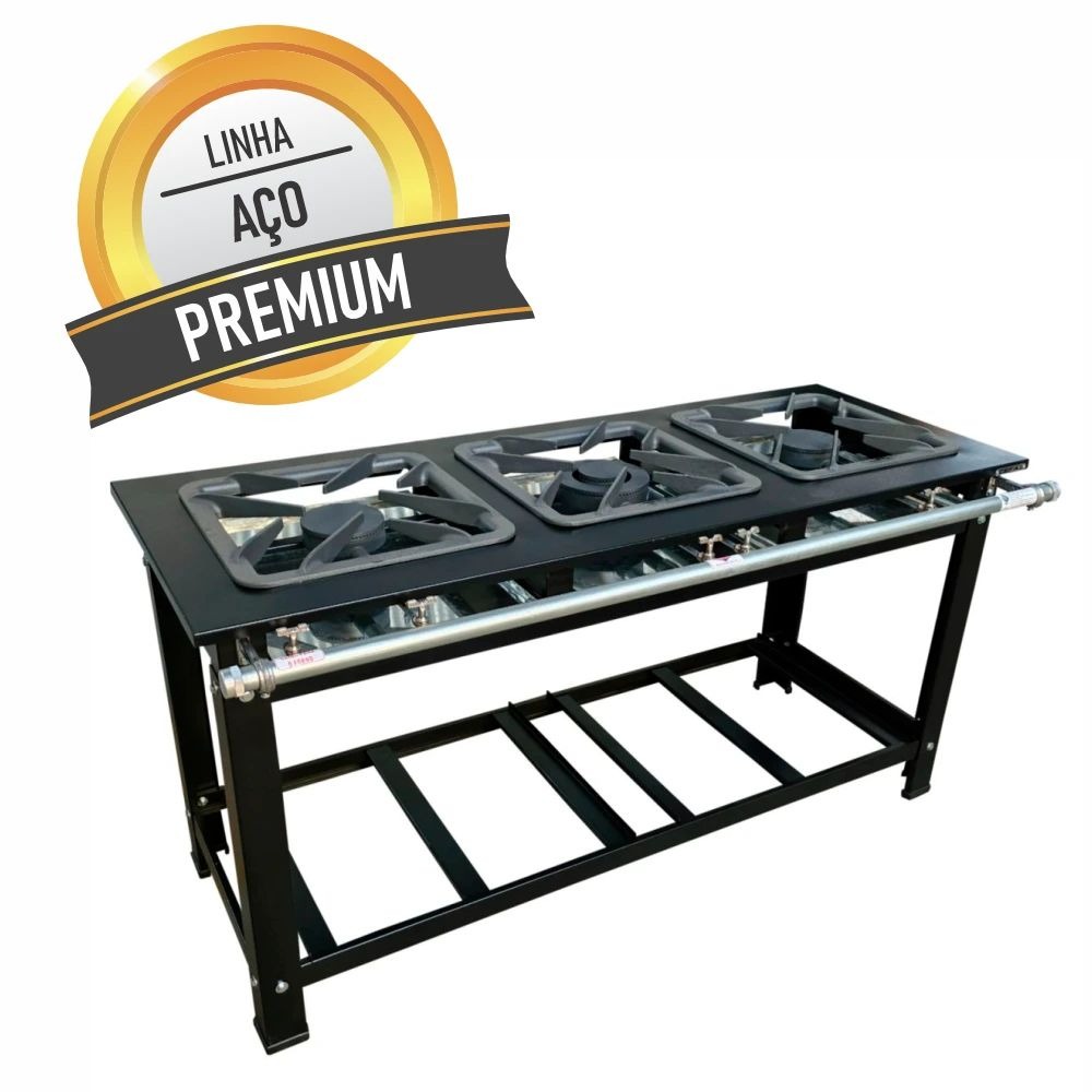 O Modelo de 3 Bocas possui Grelhas de 40x40 cm de diâmentro, sendo ideal para uso de grandes panelas e caldeirões; Além de ser fabricados com chapas de 10 cm de perfil, suportando grandes cargas de peso; Seus queimadores possuem chama dupla, podendo ser ligadas separadamente, com diâmetro de 18 cm sendo a maior chama do mercado.