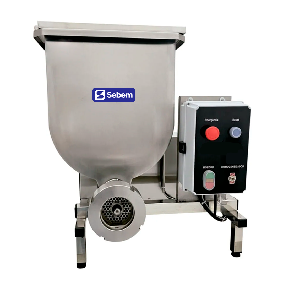 O moedor picador de carne da Sebem é ideal para frigoríficos, casas de carnes e açougues que tem uma alta demanda por carne moída e embutidos. Com ele você ganha tempo do operador pois sua alimentação é automática. Seu tanque possui capacidade para 20kg de carne e o seu moedor possui capacidade 1200kg/h, sendo uma máquina muito eficiente. No repasse após moer a carne e passar ela novamente no moedor suas pás deixam a carne com uma mistura mais homogênea, agregando valor ao produto. Sua estrutura é robusta e fabricada 100% em aço inox 304 com sistema de transmissão por motorredutor, o que faz com que a máquina tenha uma durabilidade e não quebre. Seu motor possui 3cv para o moedor e 1/4cv para homogeneizador os quais funcionam de forma independente.